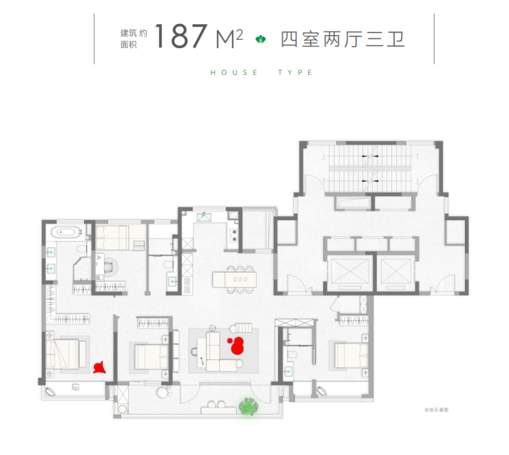 再看这个建面约187㎡的大平层,标准感直接拉满。南向面宽达到了约17.8米,几乎便是IMAX级的观景视界,窗外的景色和家里的日子融为一体。一进门是独立玄关,既保护了隐私,又能收纳不少东西,回家典礼感满满。南向的次卧给爸爸妈妈住最合适,两代人既能彼此照顾,又有自己的空间。三个卫生间的规划,早上起床再也用不着抢着用,日子沉着多了。厨房是敞开式的U型布局,还带个西式岛台,中西厨都能搞定,煮饭也成了一种享用。主卧是豪华酒店式套房,独立起居室、步入式衣帽间、带浴缸的卫生间,把爱崇感做到了极致。