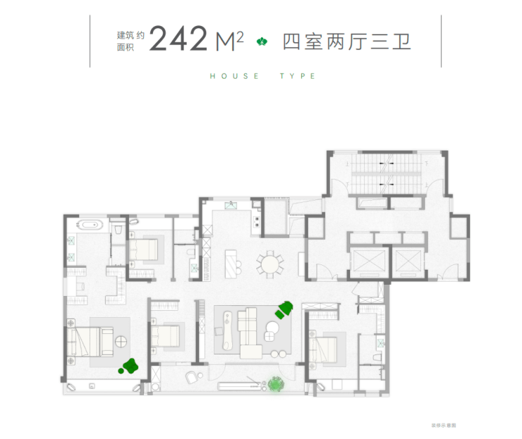 最终是这个建面约242㎡的“王炸”户型,约20.7米的南向面宽,加上两个朝南的主卧套房和三个明卫,空间感、通透感都无可挑剔。最让人冷艳的是那个约80㎡的超大餐客厅,就算隔出中西厨,也轻松放得下一张大圆桌,家里来客人或许办个家宴,气场全开。两个朝南的主卧套房都是“行政级”的,起居室、衣帽间、带浴缸的卫生间一应俱全,完全能满意高端家庭对寓居质量的挑剔要求。