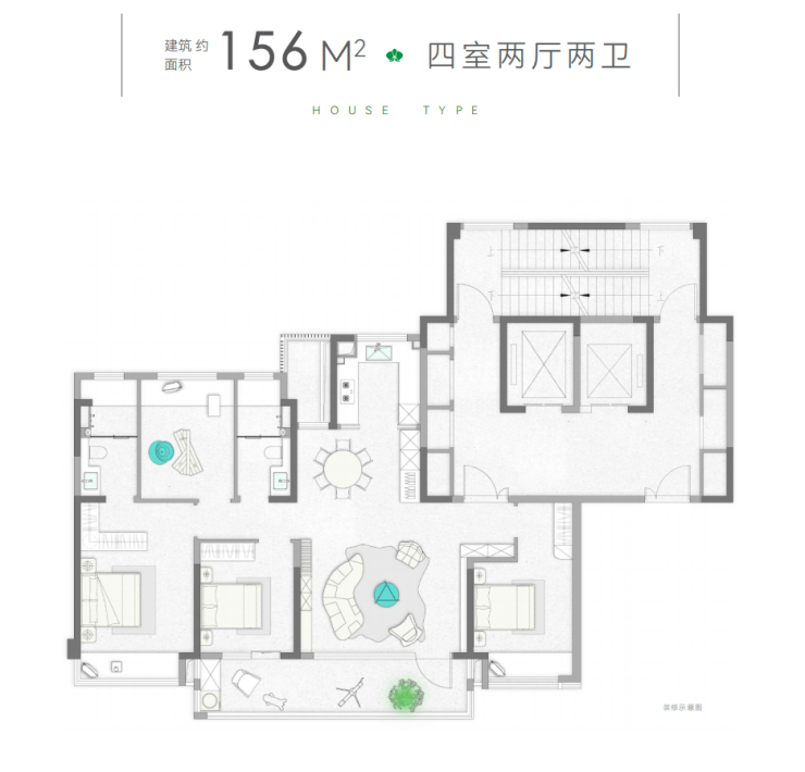 建面约156㎡的户型是这儿的“入门款”,但一点不含糊。做了4房2厅2卫,约15米的南向面宽,四个开间朝南一字排开,采光好到爆。那个大横厅连着大阳台,全体空间显得特别通透。LDKB一体化规划,加上U型敞开式厨房,一家人在厨房、客厅、餐厅之间互动无障碍,气氛感直接拉满。厨房西边还有个空间,今后能改成家政间,特别有用。